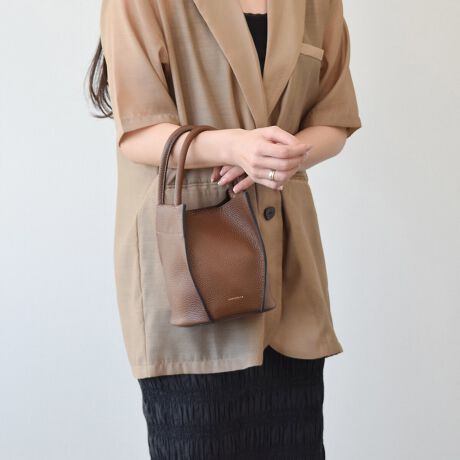 小ぶりなサイズ感とフォルムがかわいいバケットバッグは、シュリンクレザーのソフトな質感が特徴的です。ストラップ付。