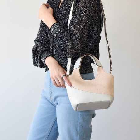 涼し気な素材感の異素材コンビハンドバッグは、コンパクトなサイズ感でもマチがしっかりあるのでデイリーにお使い頂けます。ストラップ付。