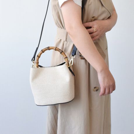 バンブーハンドルとラフィアの質感が春夏らしい印象のバケットバッグです。ストラップ付。