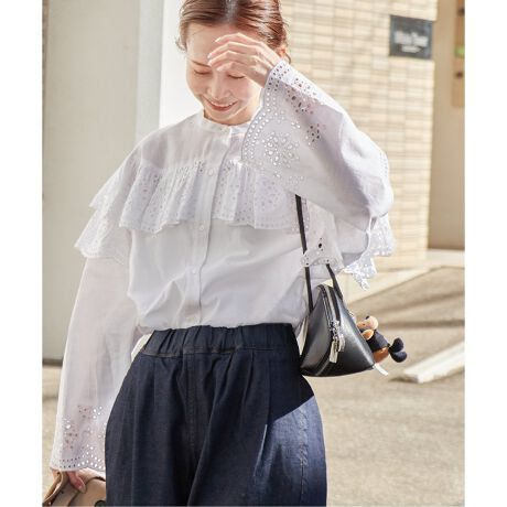 肩回りや袖口に繊細なカットワークレースのフリルが施されたデザインブラウス。