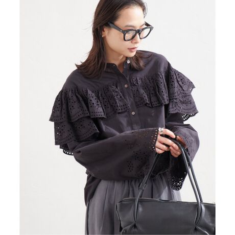 肩回りや袖口に繊細なカットワークレースのフリルが施されたデザインブラウス。
