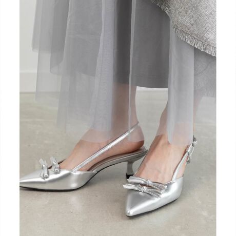 カットラインに施された華奢なリボンデザインがアクセントになるバックストラップパンプス。