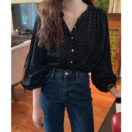 シフォン素材がトレンド感たっぷりのコーデを叶えるドットブラウス。
