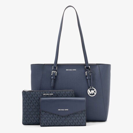 リッチなサフィアーノレザーで仕立てた使い勝手の良い広々としたトップジップスタイルのCHARLOTTE 3 IN 1 トート ラージ。2つのロゴプリントポーチで整理整頓ができ、付属のクロスボディストラップを取り付ければ、必要な時にハンズフリーで持ち運びが可能です。