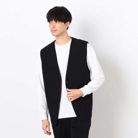 カットソーやシャツの上にレイヤードして使える着回し力の高いノーカラージレです。