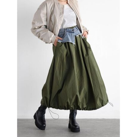 デニム生地と微光沢のナイロン生地をドッキングさせた個性際立つ異素材切替のスカート。