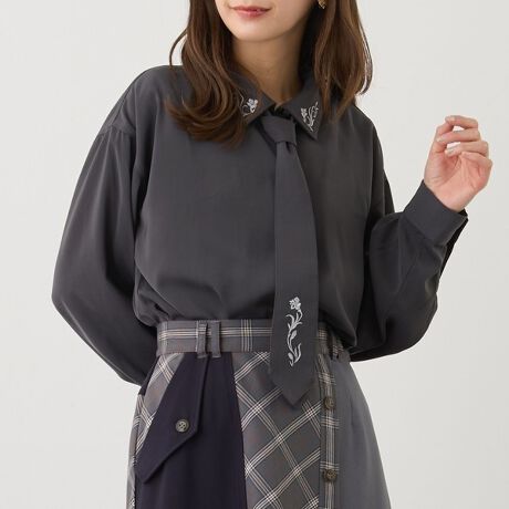 衿とネクタイにあしらったボタニカル風の刺繍がクラシカルで目を惹き、コーデのポイントになります。