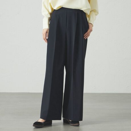 ウエストゴム仕様でイージーな履き心地ながら、裾に向かってきれいにタックが入っており、脚が真っ直ぐ見えるパンツに仕上がっています。