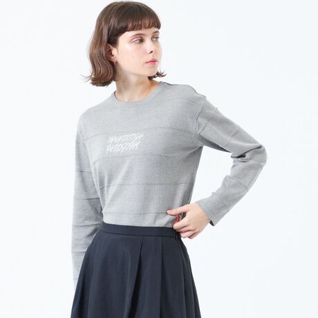 ボーダーニットに手書き風のブランドロゴをチェーンステッチ刺しゅうで表現したニットプルオーバー。