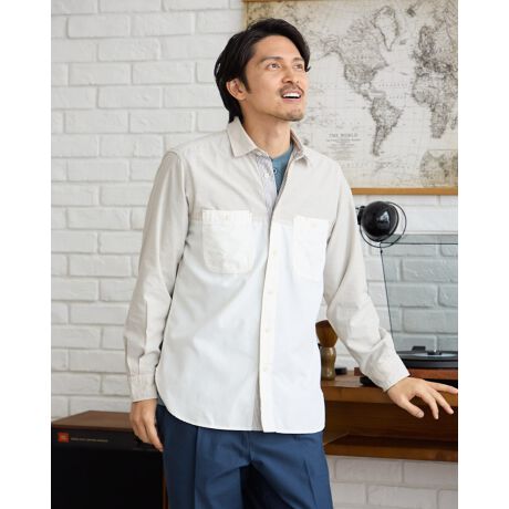 異なる生地で切替えたレギュラー襟シャツです。経糸にスラブ糸を使用したダンガリー生地とオックス生地で切替えました。製品洗いを施し表情のある風合いに仕上げました。インナーとしても羽織りとしても活躍するシャツです。