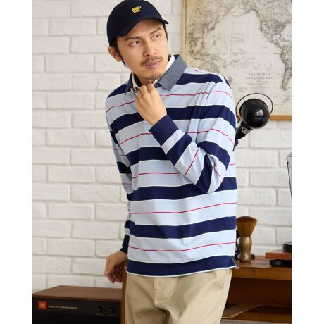ボーダーのラガーシャツです。強度のある杉綾テープの比翼前立、開閉のしやすいラバーボタンなど細部まで拘り本格的に仕上げました。リラックス感のあるゆったりとしたシルエットです。トラッドなコーディネートをお楽しみください。