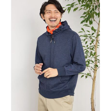 軽く羽織れるフルZIPパーカです。ダンボールニット生地でデニムのような表情に仕上げました。吸水速乾性とUV効果もある機能性も魅力です。襟/フード部分を立体的に仕上げ、顔立ちのよさが特徴です。