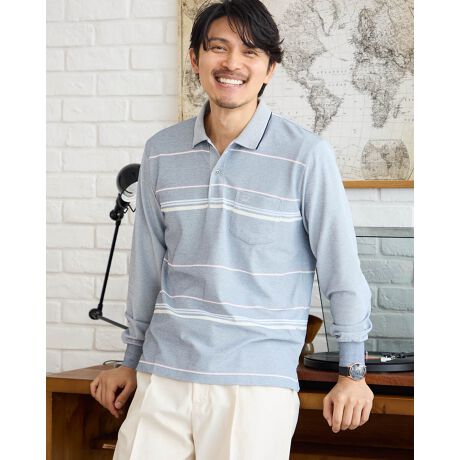 マルチボーダーの長袖ポロシャツです。凹凸感のある鹿の子生地を使用しています。肌離れがよくさらっとした着心地が特徴です。涼感のあるカラー配色がポイントで、合わせるボトムスによって様々なスタイルをお楽しみください。