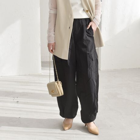 ヒールで女性らしくスタイリングする際は裾のコードを絞ってロールアップし、足もとを軽く見せると◎