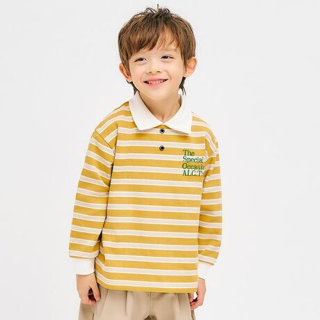 衿やボタンが付いたポロシャツ風のロンT。