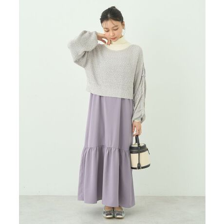 ショート丈ニットとキャミソールワンピースのセットアイテム。袖のドロストリボンでシルエットを変えられるニットは、ラメ糸を織り交ぜた素材が華やかな印象です。ワンピースはティアードデザインで、程よく広がるフェミニンなフレアシルエットが魅力的。それぞれ単品でも着回しができ、コーディネートの幅が広がるおすすめのアイテムです。