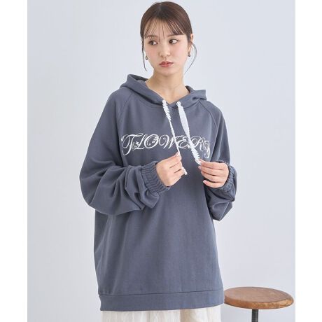 フロントの刺繍ロゴが目を惹くデザインパーカー。ラグラン切り替えのカジュアルなデザインながら、曲線的なロゴフォントやフリルテープが軽やかなフェミニンムードをプラスします。ゆとりのあるサイズ感とヒップにかかる着丈で快適な着心地も魅力的。まだ寒い時期から春先まで活躍するおすすめのアイテムです。