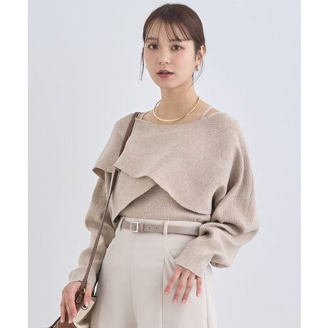 クロスニットとキャミソールをセットにした着映えトップス。左右に交差させたオーバーシルエットに横リブがモード感のあるデザインです。大きく開いた首元とキャミソールのストラップがフェミニンなムードを演出。シンプルなワンカラーでコーディネートに合わせやすく、カジュアルなデニムからスカートまで幅広く合わせていただけます。
