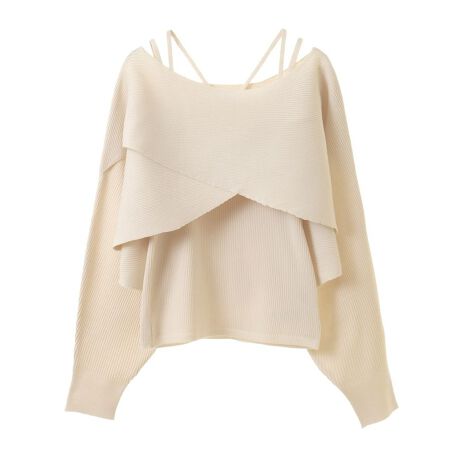 クロスニットとキャミソールをセットにした着映えトップス。左右に交差させたオーバーシルエットに横リブがモード感のあるデザインです。大きく開いた首元とキャミソールのストラップがフェミニンなムードを演出。シンプルなワンカラーでコーディネートに合わせやすく、カジュアルなデニムからスカートまで幅広く合わせていただけます。