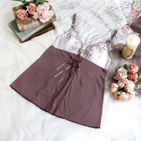 ストラップにはハートモチーフの中にブーケを添えた、お揃いのアップリケをあしらいました。前身頃は透け感のあるレースとほどけるタイプのリボンをあしらい、ラッピングをイメージした可愛らしいアイテムに。バックスタイルにはリボンを2つ並べて前身頃とリンクさせるなど、細部までこだわりを詰め込みました。