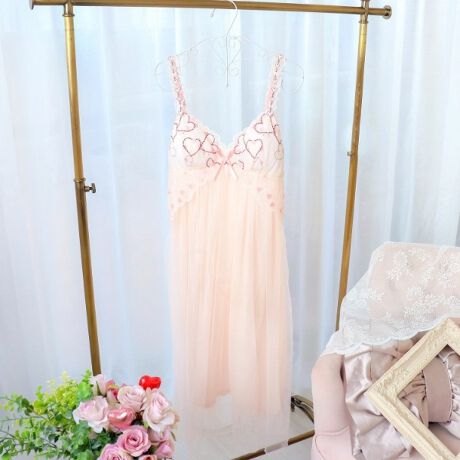 ストラップにはアクセサリーをイメージしたハートのアップリケをあしらい、シアーなフリルレースとの組み合わせが、思わず目をひく豪華なディテールに仕上がりました。マキシワンピースは胸下切り替えのレースとふんわり広がるソフトチュールで、女の子らしいフレアシルエットに。