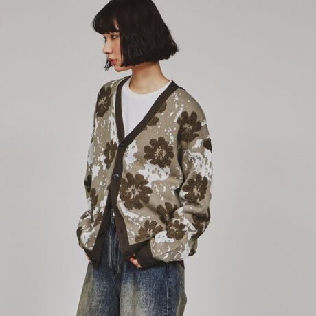 花柄とアブスト柄組み合わせたジャカード編みカーディガン。