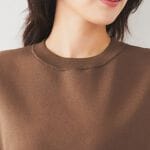 薄すぎず程よい厚みの編地にシャープでやや詰まり気味のハイクルーネックにはインナーをレイヤードしやすいよう脇スリットを入れています。