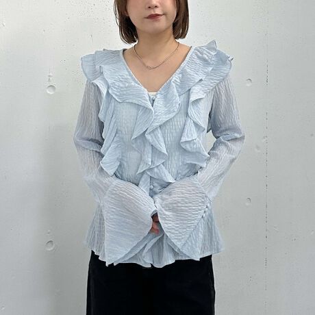 襟元のラッフルフリルとVネックに開いた首元で小顔効果◎