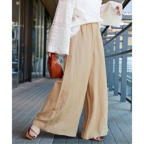 落ち感あるリネンレーヨンを使用した、ウエストゴムギャザーのワイドパンツ。