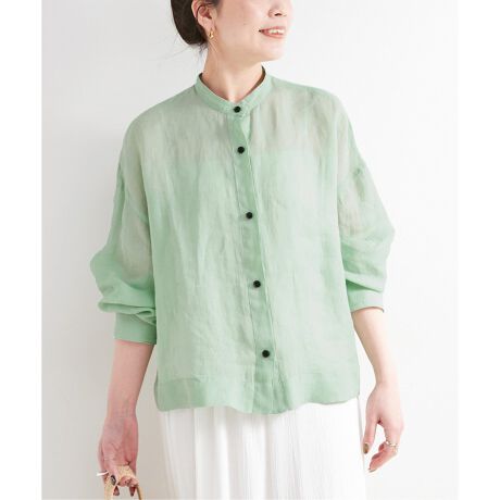 スタンドカラーのやや短めの丈感ですっきりとしており、透け感が繊細かつ華奢すぎないのでカジュアルアイテムとも相性よく着ていただけます。