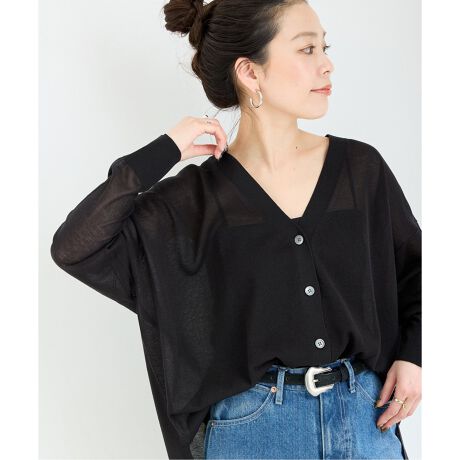 着心地:身幅があるものにも合わせやすいシルエットでほどよいシアー感で着やすいです。深すぎないV開きでプルオーバーとしても着られます。