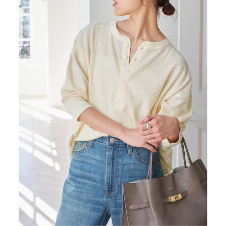 開閉可能なヘンリーネックはクルーネックほどカジュアルではなく、シャツほどきっちりしない程良いニュアンスが魅力。
