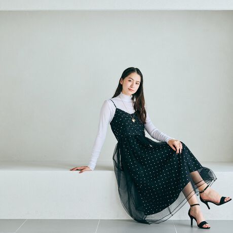・程よくハリのある素材にドットプリントを施し、レーヤードでチュールを重ね、軽やかでほんのりとモード感が漂うデザイン。