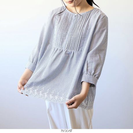 胸元のピンタックと、裾に入る刺繍がデザインポイント。