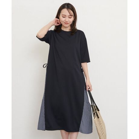 サイドをストライプ柄で切り替えた異素材デザインのワンピース。