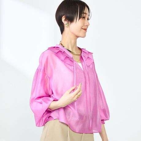 ・顔周りが映える、ラッフルディテールが華やなブラウス