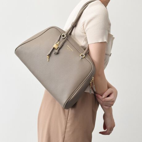 ベーシックなデザインのチャーム付きシュリンクレザーハンドバッグは、飽きのこないデザインなので、長くお使いいただけます。