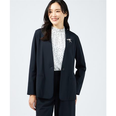 ノーカラー×Vネック、ワンボタンのすっきりとしたデザインのジャケット。キレイ目感もあり、お出かけコーディネートにもぴったりです。同素材のパンツと合わせて統一感を出すと式典などにも活用できます。