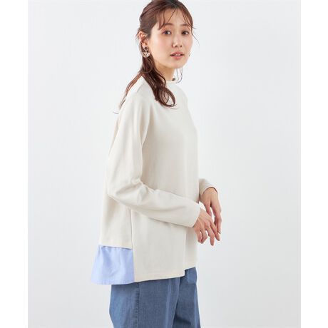 後ろ身ごろの裾を布帛で切り替え、コーデに差が付く遊び心のあふれるデザインに仕上げました。裾広がりのラインで気になるお腹まわりもカバー、ジャカード素材ならではのきちんと感でカジュアルにならないのもポイントです。