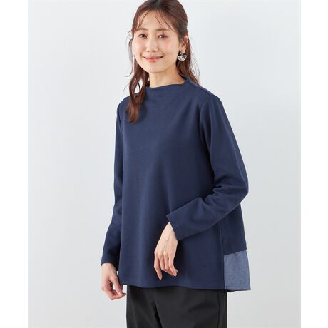 後ろ身ごろの裾を布帛で切り替え、コーデに差が付く遊び心のあふれるデザインに仕上げました。裾広がりのラインで気になるお腹まわりもカバー、ジャカード素材ならではのきちんと感でカジュアルにならないのもポイントです。