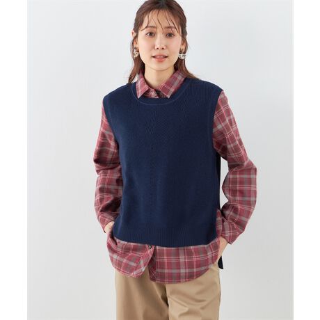 [型番:492805]着こなしにトレンド感をプラスするカラバリ豊富なニットベストステッチや編み地切り替えなどディティールにもこだわりました。前側をショート丈で切り替えることであわせたトップスを見せつつスタイルアップもお任せ、インナー次第でカジュアルにもきれいめにも着まわせるアイテムです。モデル身長:165cm Mサイズ着用