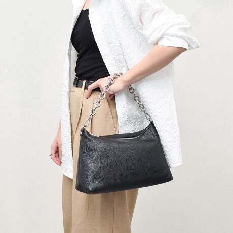 シボ感のあるソフトなレザーを使用したショルダーバッグは、チェーンストラップがスタイリッシュな印象です。