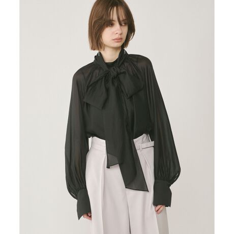 シーズンムードを引き立てる、レーヨンブレンドのシアー素材でお作りしたボウタイブラウス。上品な光沢があり、シャリみのある表情豊かな素材が春の気分を盛り上げてくれる一枚です。たっぷり用尺をとったゆったりとしたシルエットにボリュームたぷりなスリーブで、ふわっと軽やかなデザインに仕上げました。胸元には取り外せる大きなボウタイを添え、前で華やかにリボン結びをしたり、あえて後ろで巻くのもおすすめです。清涼感溢れるホワイトに、トレンドが色付く爽やかなイエロー、品よく決まるブラックの3色をご用意しました。