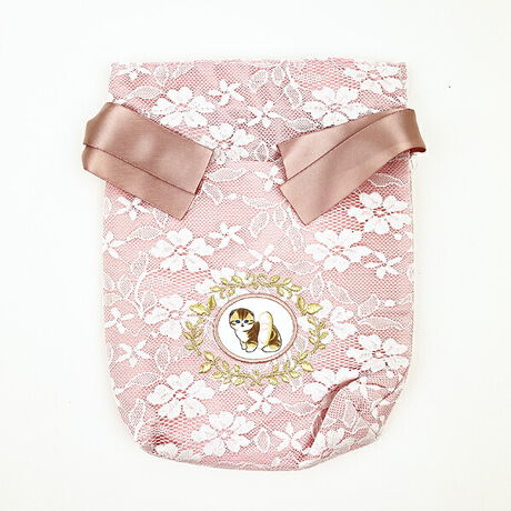 レースと刺繍のデザインが大人カワイイモフサンドの巾着袋です。大き目サイズでたっぷり入ります♪ドーナツにゃんのワッペンがポイント♪