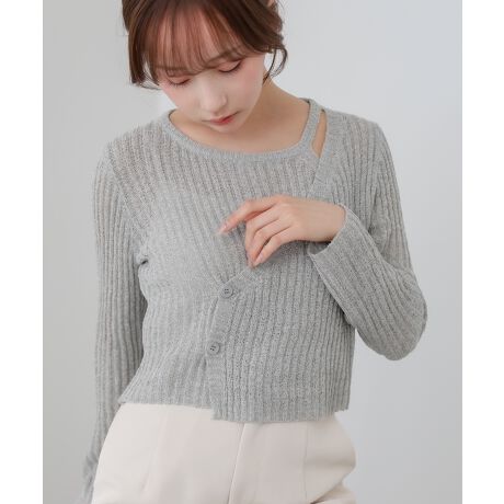 アメスリタンクとクロップドカーディガンをレイヤードしたような主役級トップスが登場!アシンメトリーのモダンなデザインが新鮮な1枚です。ざっくりと編まれたリブ編みはシアー感を演出し、左肩の控えめな肌見せはヘルシーで女性らしい雰囲気をプラスしてくれます。程よいルーズ加減で普段の着こなしに抜け感を出してくれます。