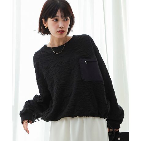 柔らかいジャガード織の風合いが印象的なプルオーバーが新登場!ドローコード付きの裾デザインでシルエットを自在に調整できます。ゆったりとした身巾と短丈デザインが、リラックスしつつもすっきりとした印象を演出。アクセントとなる異素材ポケットがシンプルな中にも遊び心をプラスしてくれます。デニムやスカートと合わせてカジュアルにもフェミニンにも楽しめる万能アイテムです。