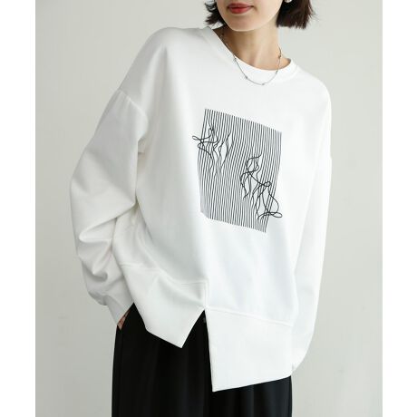 まず目を引くのは、アートなプリントデザイン。モノトーンでシンプル。品の良さを感じさせる仕上がりです。さらに、アシンメトリーなカッティングが、シンプルながらも個性的なシルエットを演出。裾にさりげなく入ったスリットは、動きやすさだけでなく、全体のバランスを美しくまとめています。