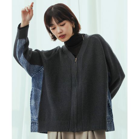 このブルゾンは、異素材ミックスが生み出す絶妙なバランス感が特徴です。デニム生地と、柔らかく編み込まれたアクリルコットン糸を使った編地を組み合わせたデザイン。カジュアルでありながら、どこか上品さを感じさせる仕上がりです。Vネックとジップファスナーがスタイリッシュな印象を与え、羽織るだけでさりげないおしゃれが完成します。両脇にはコンパクトなスラッシュポケットがあり、スマートに使える便利な作りです。ざっくりとしたサイズ感で、重ね着もしやすく、春から秋まで長く活躍する一着です。