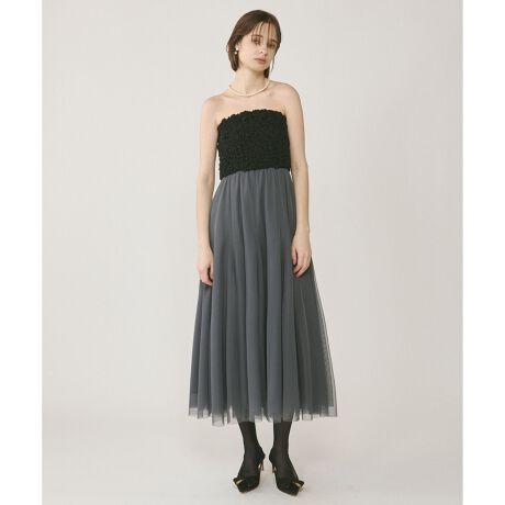 美しいチュールの重なりが目を惹く、大人のベアドレス。ベア部分は、細やかで華やかなシャーリングテクニックを入れて表情感をプラスしたオーガンジー素材を使用。裏面はカットソー素材を使用し、肌あたりも優しく着心地にも配慮しました。スカート部分は、繊細なシアー感と用尺をたっぷりとった贅沢なフレアシルエット。歩く度に美しく優雅に揺らぐ姿が印象的で、より一層フェミニンな気分を高めます。シックなカラーとシンプルながらも個性の効いたデザインが、飽きる事なく末永くご愛用いただけるポイント。肩紐も別途付き、キャミワンピースとしてもご利用可能。そのまま一枚でパールやビジューなどのアクセサリーをプラスしてお食事会やドレスアップスタイルに、ハイネックニットやシアートップスを中に添えたレイヤードスタイルをと、様々な着回しをお楽しみください。