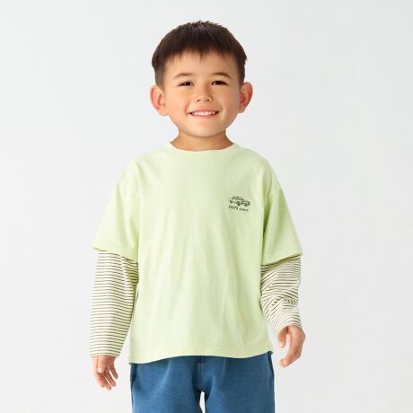 1枚で半袖Tシャツと長袖Tシャツをレイヤードしたスタイルが完成するトップス。
